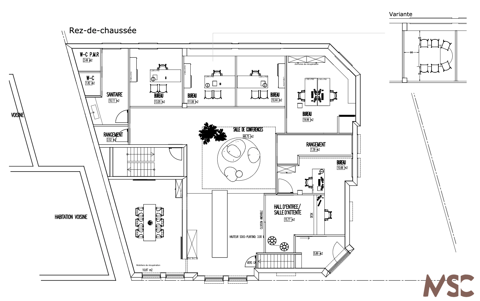 - 3 bureaux individuels meublés et/ou possibilité de les combiner