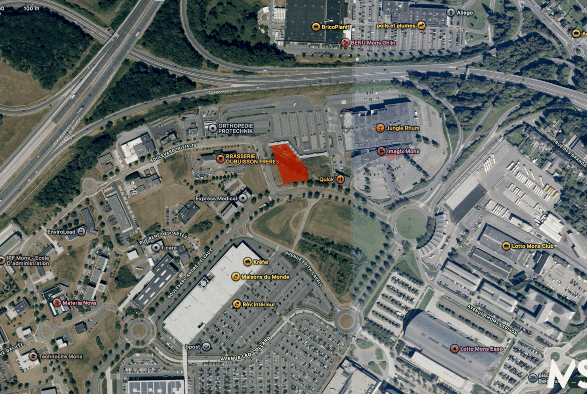 Idéalement situé à l’entrée du site des Grands Prés, ce terrain bénéficie d’une visibilité exceptionnelle et d’un environnement commercial dynamique. Le site s’inscrit dans un pôle urbain en plein essor, où se côtoient entreprises innovantes, institutions académiques, enseignes commerciales et équipements de loisirs. Ce quartier stratégique profite de la synergie entre Technocité Mons, le Parc Initialis et le complexe commercial voisin, créant un écosystème idéal pour développer un projet mixte, de bureaux ou une implantation commerciale de premier plan.